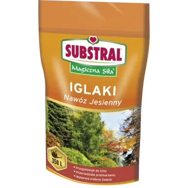 Substral Magiczna Siła Jesienny do Iglaków 350 g to specjalistyczny, jesienny nawóz interwencyjny przeznaczony do iglaków. Działa szybko, jest wysoko skoncentrowany i w pełni rozpuszczalny w wodzie, dzięki czemu łatwo się go aplikuje – zarówno dolistnie, jak i doglebowo.